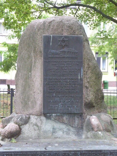 Auf der Tafel steht: „Die Große Synagoge wurde 1939 von den Nazis zerstört, die kleine Synagoge in ein „Aussiedlungs“-Zentrum umgewandelt. Zwischen 1939 und 1943 „siedelten“ die Nazis ungefähr 7000 Juden aus Koło und der Umgebung aus und deportierten sie in die Vernichtungslager. Im ewigen Gedenken“ (in einer kleinen Grünanlage, Nowy Rynek)