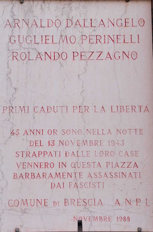 Gleich neben dem Palazzo Loggia befindet sich an dessen Seitenwand an der Piazza Rovetta eine Gedenktafel für die Opfer der Vergeltungserschießungen vom 13. November 1943 Arnaldo Dall’Angelo, Guglielmo Perinelli und Rolando Pezzagno.