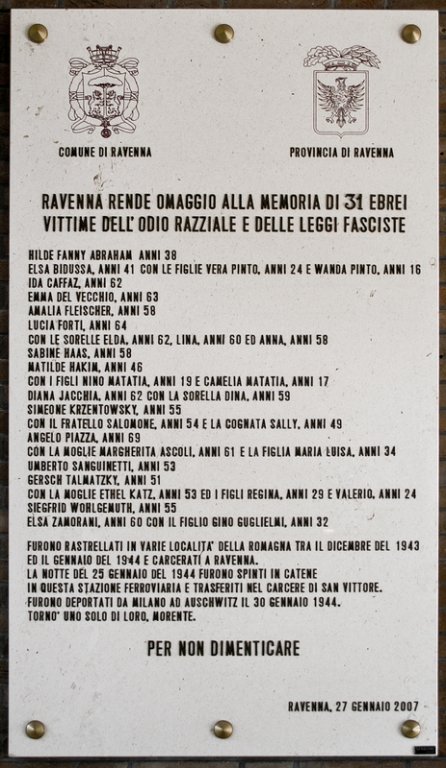 In der Halle des Bahnhofs von Ravenna (Piazza Carlo Luigi Farini) befindet sich eine Tafel, die der 31 Jüdinnen und Juden aus der Provinz gedenkt, die von dort aus in der Nacht vom 25. auf den 26. Januar 1944 über Mailand in das Vernichtungslager Auschwitz deportiert wurden.