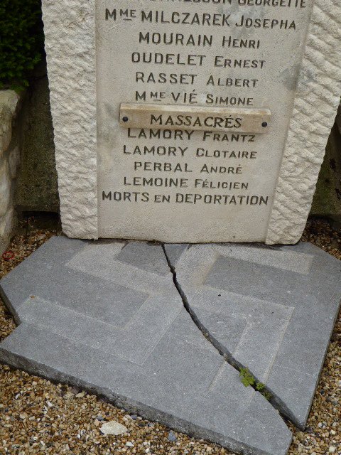 Das Denkmal nennt die Namen der 21 Opfer des Massakers, darunter elf Frauen, und von vier Deportierten. Es steht auf einer Platte mit einem zerbrochenen Hakenkreuz (Kreuzung Grande Rue/Rue de la Résistance). An einzelnen Häusern weisen Gedenktafeln auf Erschossene hin (z.B. der Familie Lalin/Hurson).